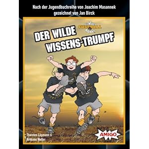 Die wilden Fußballkerle: Der Wilde Wissens-TrumpfDies ist das ultimative wilde Wissenstrumpf-Spiel rund um die Welt der Wilden Fussballkerle und der Unbesiegbaren Sieger. Große Gewinnchancen hat der Spieler, der sich bei Marlon, Jojo oder beim Dicken Michi gut auskennt. Doch Wissen allein reicht bei diesem Spiel nicht. Wer zusätzlich geschickt aufs Tor schießen oder einen langen Pass zum Mitspieler schlagen kann, ist hier der wahre Champion.So spielt man Die wilden Fußballkerle - Der Wilde Wissenstrumpf:Die 32 Trumpfkarten (z. B. der Wilden Kerle) werden gemischt. Jeder Spieler erhält 16 Karten als Stapel auf die Hand. Die Torwand wird in die Tischmitte gestellt. Daneben kommt der Schussstein. Der Startspieler liest auf seiner vordersten Handkarte eine der vier Trumpfkategorien und ihren Wert vor. Der Gegner liest in der gleichen Kategorie seinen Wert vor. Steht anstelle des Wertes ein Joker, hat er das Duell gewonnen. Ansonsten gewinnt der höhere Wert. Nun stellt der unterlegene Spieler dem Duellgewinner eine Frage von seiner in diesem Duell eingesetzten Karte. Kann der Duellgewinner die Frage beantworten, gewinnt er die Karte des Verlierers und steckt sie hinter seinen Kartenstapel, andernfalls verliert er seine Karte an den Gegenspieler! Steht auf der Karte keine Frage, sondern das Wort "Torwand", so muss der Duellgewinner keine Frage beantworten, sondern auf die Torwand schießen. Der Schussstein wird in ca. 25 cm Entfernung zur Torwand platziert. Trifft der Duellgewinner durch die Toröffnung, erhält er die Karte des Gegners. Fällt das Tor um oder verfehlt er das Tor, muss er dem Gegner seine Karte geben. Nach 16 Duellen erhält der Spieler, der nun weniger Karten auf der Hand hat die Spielendekarte und steckt sie hinter seinen Kartenstapel. Jetzt werden so lang Duelle ausgetragen, bis die Spielendekarte wieder auftaucht. Es gewinnt der Spieler, der mehr Trumpfkarten auf der Hand hat.
